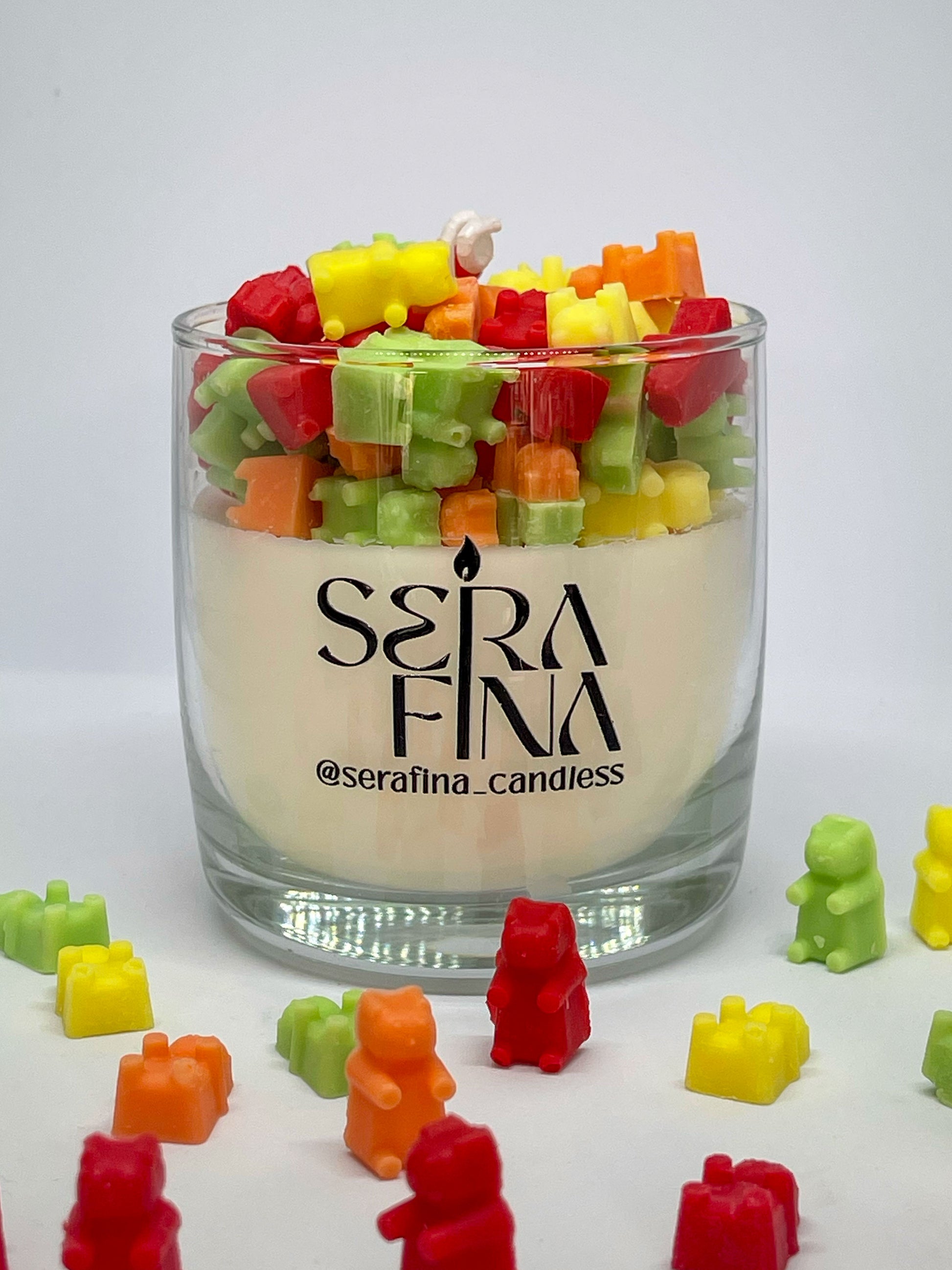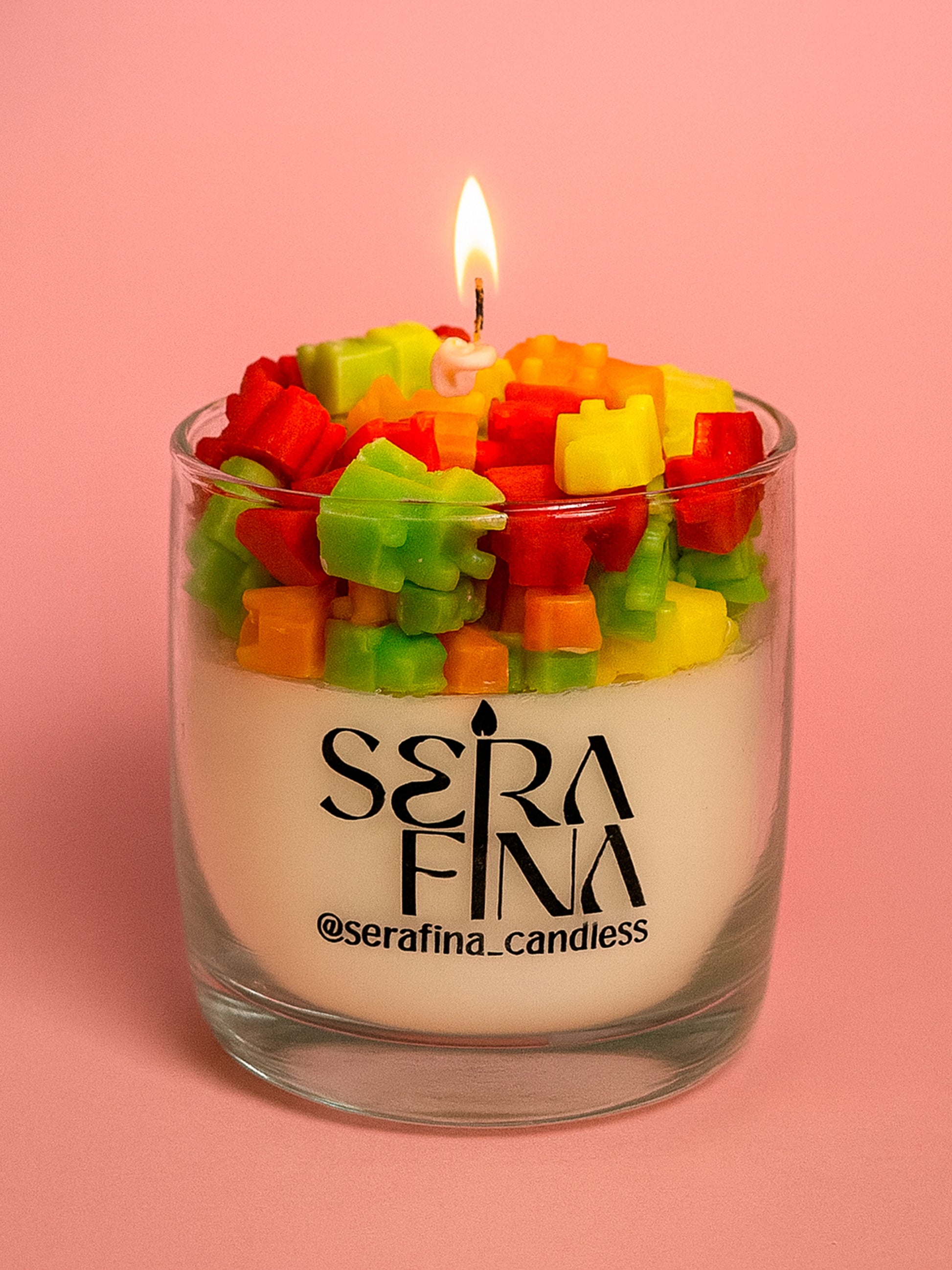 Tan vibrante como un dulce, pero hecha completamente de cera, es una vela artesanal elaborada 100% con cera de soya vegetal, libre de aditivos y totalmente decorativa.