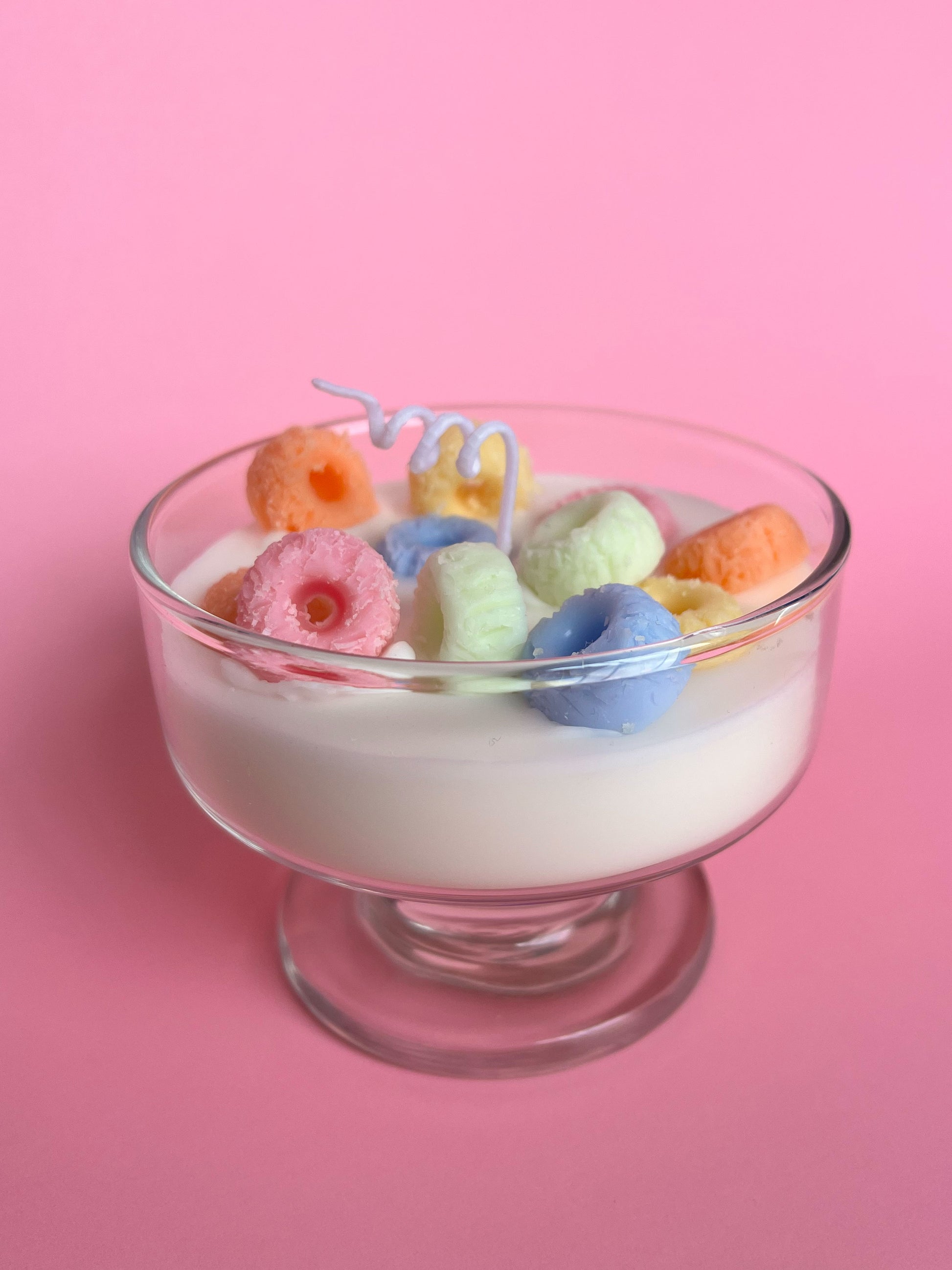 Tan colorida como un desayuno divertido, pero hecha completamente de cera. Froot Loops es una vela artesanal elaborada 100% con cera de soya vegetal, libre de aditivos y totalmente decorativa.