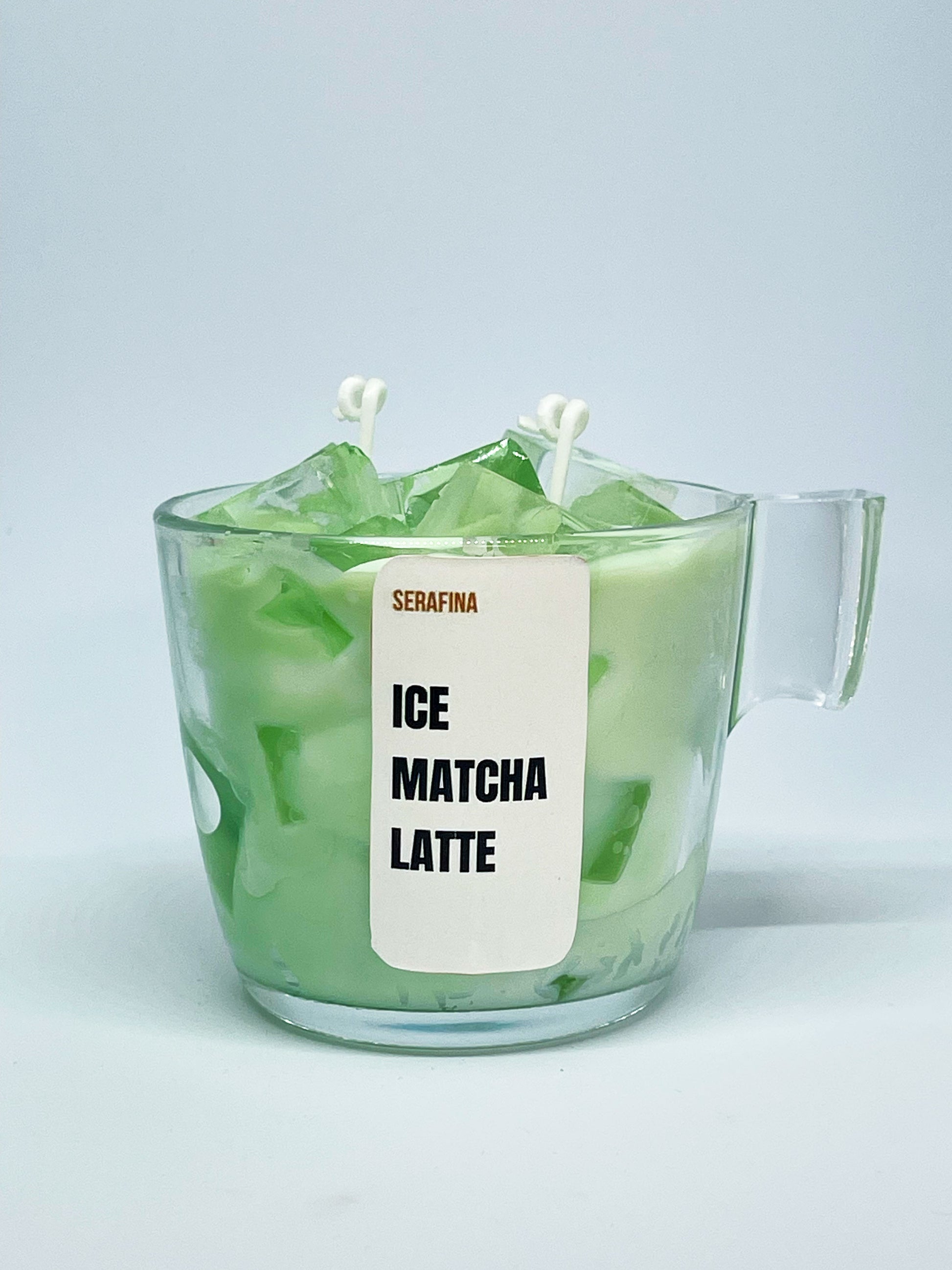 Una vela única inspirada en la frescura del matcha. Hecha con cera de soya 100% vegetal y detalles en cera de gel, esta vela recrea a la perfección un ice matcha latte con sus cubos “helados” verdes.