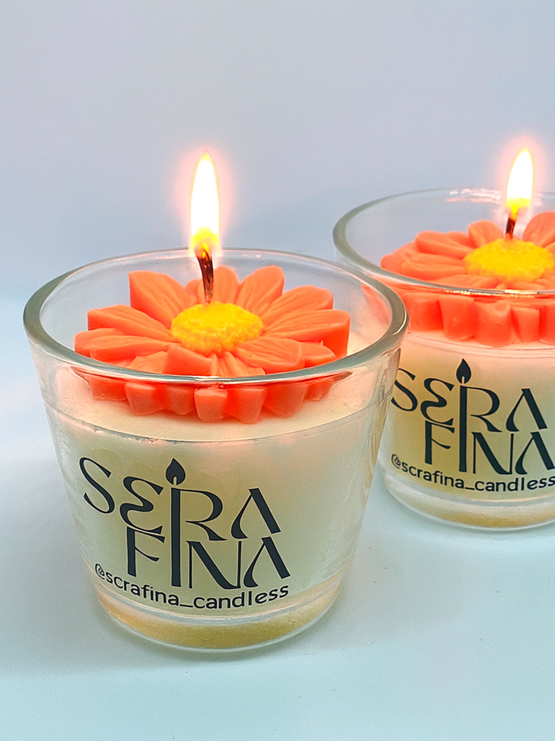 El contraste entre el centro amarillo y los pétalos naranjas le da un toque alegre y vibrante, ideal para acompañar tus momentos de calma o decorar con estilo.Un mini detalle que guarda la magia de una gran vela. 💛